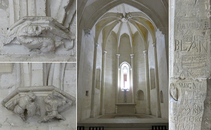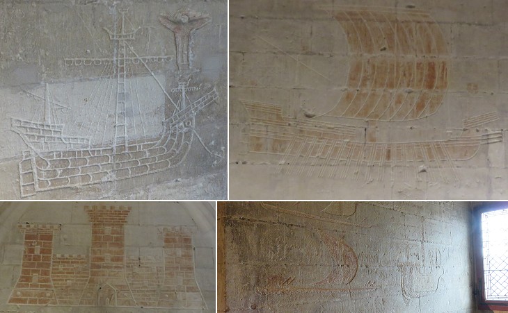 Castle of Tarascon: (left) reliefs on the ground floor; (centre) chapel; (right) graffiti by soldiers