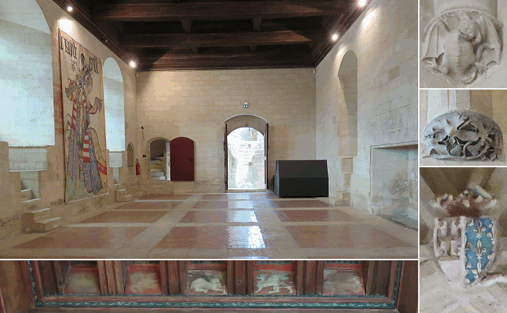 Castle of Tarascon: (left) Salon du Roi and its ceiling; (right) details of the Royal Apartments