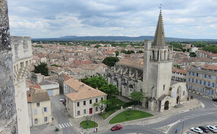 View of the town and of Collegiale Royale Sainte-Marthe from the Castle with the Alpilles in the background