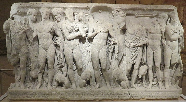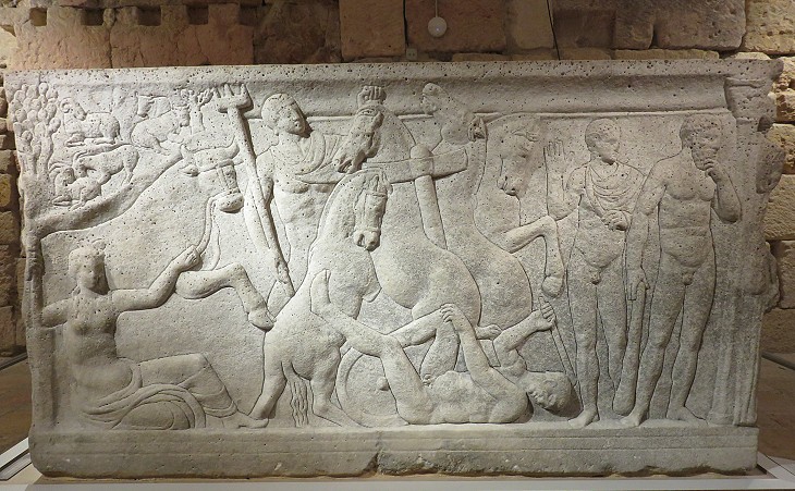 The myth of Hippolytus was very popular and he and his hunting companions were portrayed in many sarcophagi, e.g. at Tripoli, Arles and Capua. The death of Hippolytus however was not often depicted. Hippolytus, son of Theseus, was unjustly charged with having raped Phaedra, his stepmother.