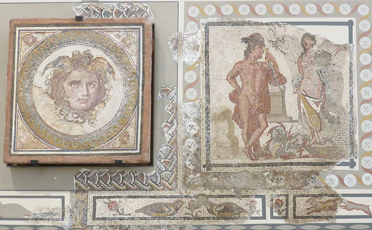 This large floor mosaic was found in 1845; it is mainly a geometrical one but it had some emblemata, small sections portraying figures; only two of them remain and both are linked to the myth of Perseus; the image of Medusa is very finely executed whereas that showing Perseus with Andromeda is ordinary. It could be that the former was made by a more skilled craftsman at a later time to replace a damaged part of the mosaic. The Gorgons, i.e. Medusa and her two sisters, were often portrayed in mosaics (Sousse), sarcophagi (Antalya) and monuments (Leptis Magna) because they had the power of turning away evil influences.