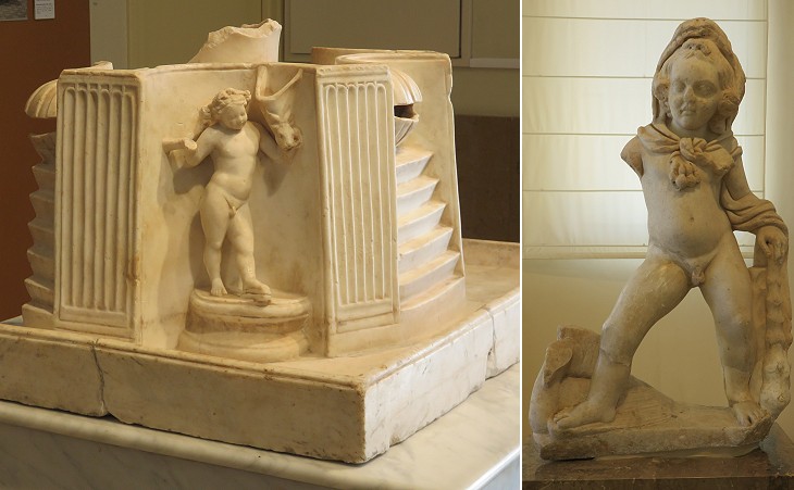 National Archaeological Museum of Tarragona: (left) domestic fountain (IInd century AD - see a similar one near Rome); (right) statue of Infant Hercules strangling a goose, a symbol of Juno, which was found at Collegium Fabrum, the seat of the corporation of building workers of Tarragona (marble from Paros)