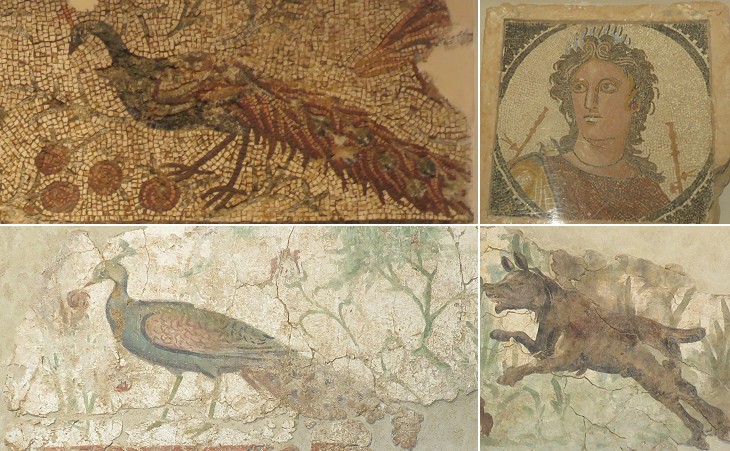 National Archaeological Museum of Tarragona: mosaics (above) and frescoes (below) portraying animals and Euterpe, the Muse presiding over music (this mosaic was found at Villa dels Munts while the other exhibits were found at Tarragona)