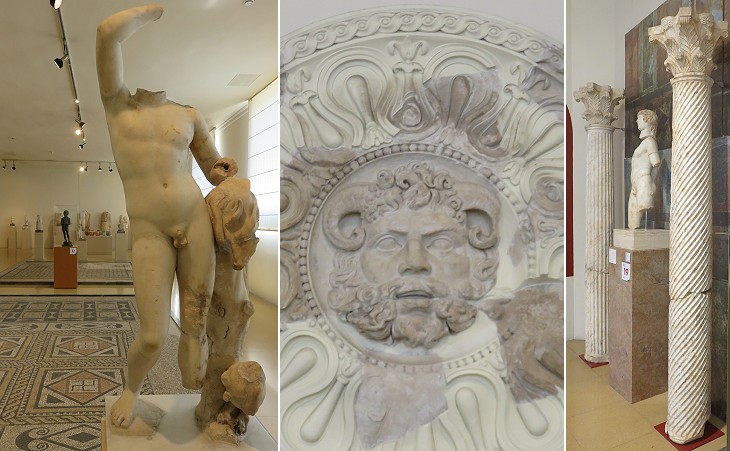 National Archaeological Museum of Tarragona: (left) Dionysus/Bacchus (IInd century AD) ; (centre) relief portraying Jupiter Ammon similar to those at Foro di Traiano and Merida; (right) marble columns and a statue from Villa dels Munts; see other statues which were found in the theatre