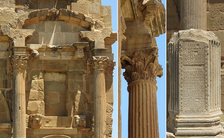 This imposing monument welcomed visitors to Thamugadi and showed the magnificence of the enlarged town. The design of the arch is similar to that of the arch erected to Septimius Severus in the Roman Forum, the decoration of which however was based on reliefs rather than statues.