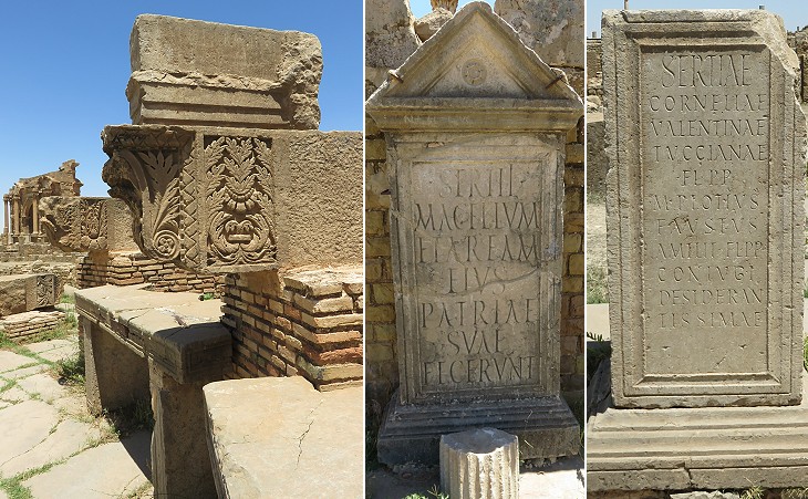 Sertius' Market: (left) one of the marble counters; (centre/right) inscriptions celebrating the construction of the market and in particular the donations made by Cornelia Valentina Tucciana, wife of Plotius Faustus Sertius, another "Flamen Augusti"