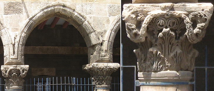 It is generally thought that the eastern portico is a reconstruction of a previous Roman building, not just that its columns and reliefs come from Roman monuments; this building could have been the scene of a theatre (see that of Bosra); in this case the columns and entablatures were the decoration of a blank wall, which later on was rebuilt as a portico.