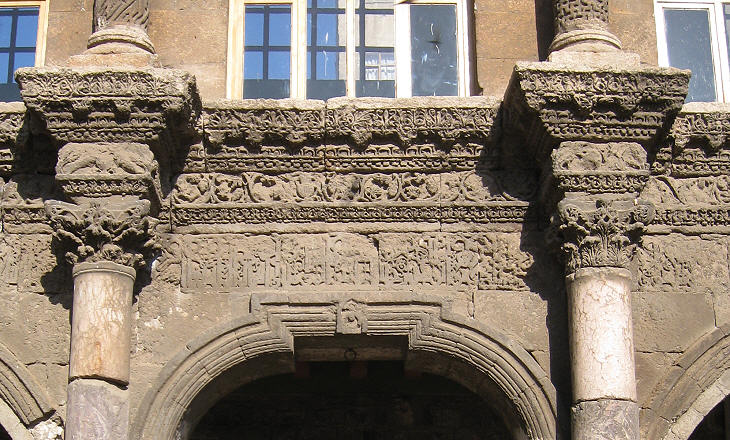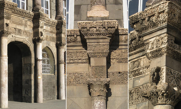 The decoration of the entablature is based on three bands; the oldest one is placed at the top; a frieze with a vine stalk forming loops around leaves and bunches of grapes is in a middle position and it probably belongs to a VIIth century Byzantine building; the lower band is a Kufic inscription of the Artukid period which says that the portico was completed in 1117.
