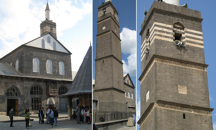 Ulu Cami was built in 1092 on the site of a previous mosque which in turn replaced a church dedicated to St. Thomas; it is a very wide building in relation to its length; the interior is similar to that of the Great Mosque of Damascus. At the time of its construction Diyarbakir was part of a large Seljuk Empire founded by Malik Shah after the 1071 Byzantine defeat at Manzikert; it included parts of Anatolia, Mesopotamia, Persia and Syria. Malik Shah died in 1092; dynastic quarrels led to the dissolution of this empire. A few years later the heirs of Artuk, a general under Malik Shah, took control of Diyarbakir. The square minaret was built during the Artukid rule; its decoration based on white stripes and inscriptions is similar to that of a tower near Yeni Kapi.