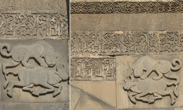 The arch leading to the courtyard is decorated with reliefs showing two lions attacking two bulls; similar reliefs can be seen on the palace of the Artukids rulers of Diyarbakir. When compared to the nearby very elaborate Kufic inscriptions these reliefs have a very naive appearance which is difficult to explain; the lion's tail in particular seems more a calligraphic exercise than the depiction of an actual tail.