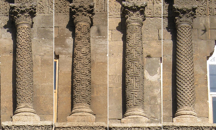 The porticoes are supported by pointed arches, but the central arch of the eastern portico and three arches of the western one are of a very unusual and elaborate design: this kind of broken arch is supposed to derive from patterns developed in Central Mesopotamia (today's Iraq). In Turkey it was first used in these porticoes.