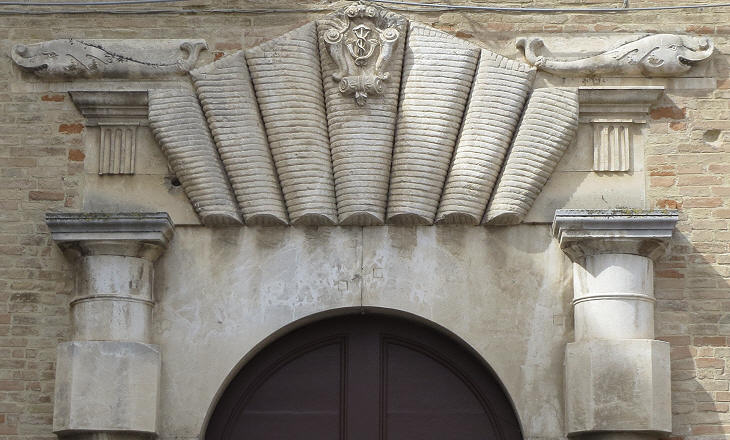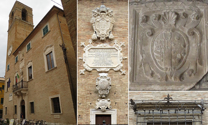 (left) Palazzo Comunale (Town Hall); (centre) coat of arms of Pope Urban VIII above an inscription celebrating the new name of Castel Durante (you can see it better in the introductory page); (right-above) coat of arms of Federico Ubaldo, Duke of Urbino and Claudia de' Medici, his wife; (right-below) decoration of Palazzo del Monte di Pietą with acorns (symbol of the della Rovere) and fleur-de-lys (most likely the symbol of Vittoria Farnese, wife of Duke Guidobaldo II)