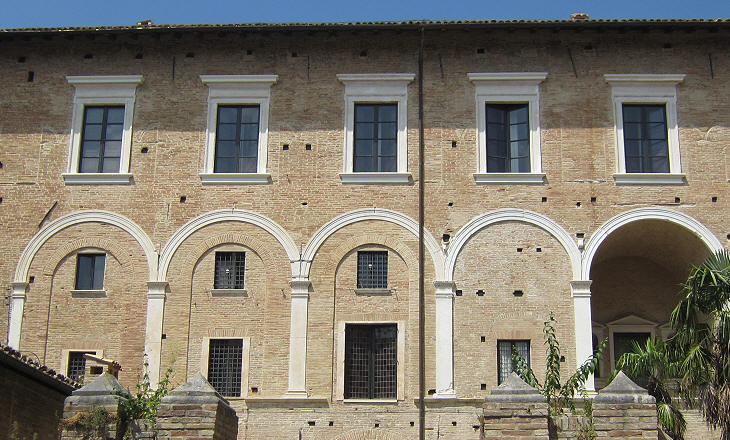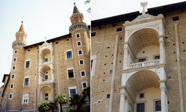 Palazzo Ducale is built on the edge of the hill and its rear side is supported by massive substructures. It is clearly visible from a great distance to travellers coming to Urbino from Rome and therefore Laurana built a rear façade which immediately showed the wealth and power of Federico to them. The two slender cylindrical towers have become the symbol of the town. The three large loggias having the shape of a Roman triumphal arch (their vaults recall that of Arco di Settimio Severo in Rome) show the ingenuity of Laurana in breaking away from medieval patterns.