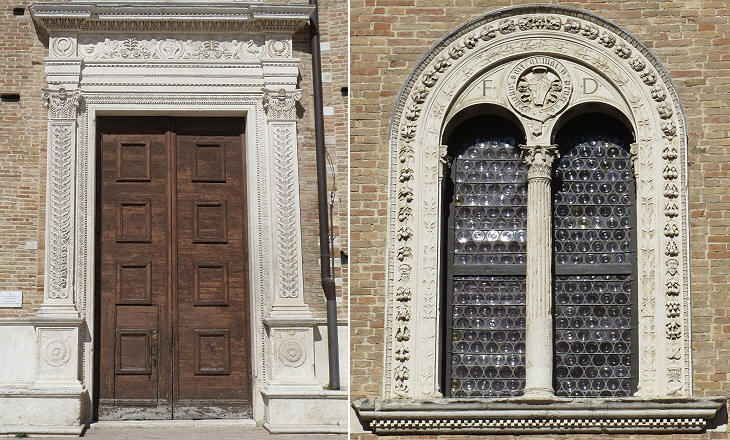Maso di Bartolomeo had worked in Tuscany with Donatello and Luca della Robbia prior to coming to Urbino and a glazed terracotta of the latter was placed in the portal (the original is inside Galleria Nazionale delle Marche in Palazzo Ducale). Considering that it was built in 1449-1451 the portal is regarded as the first Renaissance monument of Urbino.