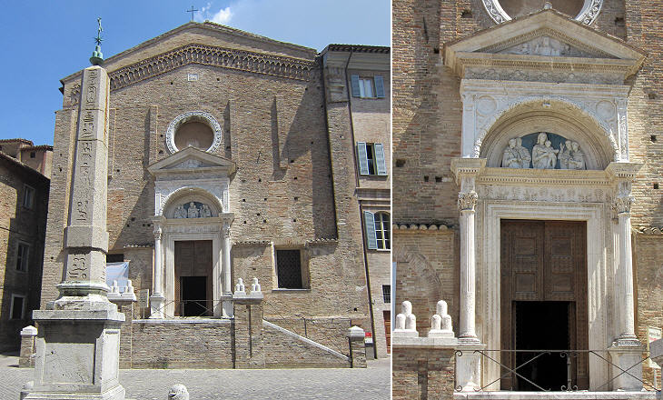 S. Domenico: (left) façade (the obelisk in the foreground is covered in a page dedicated to what Pope Clement XI and cardinals of his family did for Urbino in the XVIIIth century); (right) portal