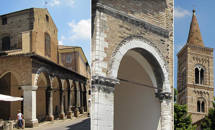 S. Francesco: (left) façade; (centre) detail of the portico; (right) bell tower