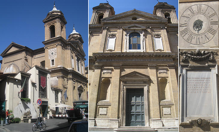 (left) Studio Tadolini, il Babuino and S. Atanasio dei Greci; (centre) façade; (right-above) clock, the hand of which is a dragon, the heraldic symbol of