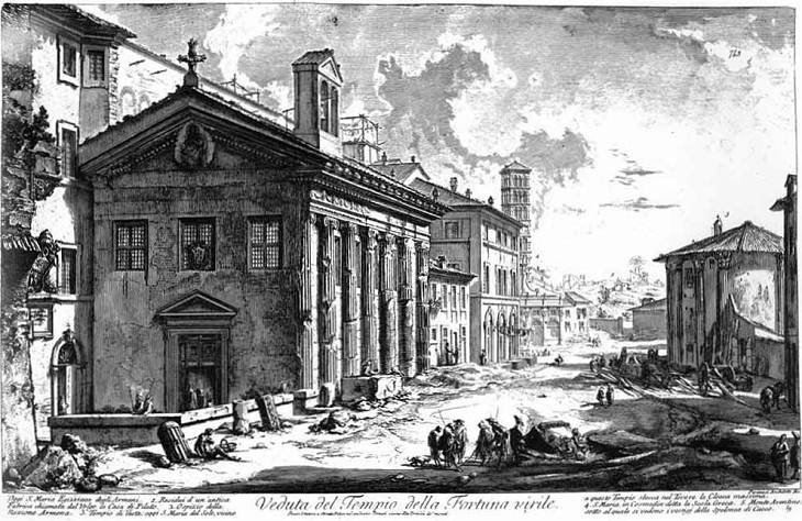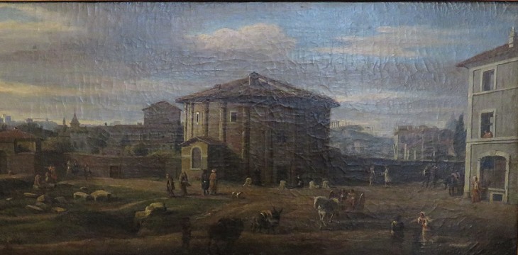 Maria in Cosmedin and the beach near that church. This view was most likely influenced by an earlier painting by Gaspar Van Wittel (it opens in another window). The temples appeared also in a 1761 etching by Giovan Battista Piranesi (it opens in another window), who however chose to depict them from a different angle.