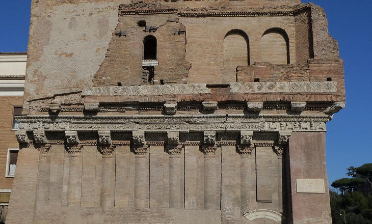 Archaeologists have not been able to exactly identify all the ancient buildings from which capitals and friezes were taken. What is evident is that the Crescenzi assembled materials which best suited their desire to restore the ancient decorum of Rome, as stated in the long inscription above the entrance.