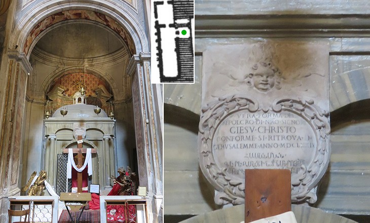 S. Nicola da Tolentino: (left) Cappella del S. Sepolcro from S. Maria Egiziaca; (right) 1650 inscription stating it is identical to that in Jerusalem; (inset) plan of S. Maria Egiziaca from the small 1748 map with (green dot) the site of Cappella del S. Sepolcro