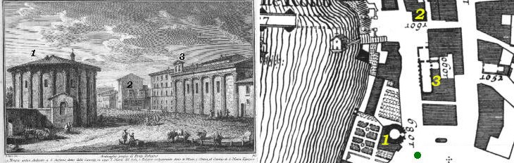 This 1754 etching by Giuseppe Vasi shows a charming corner of XVIIIth century Rome with two small ancient temples which were turned into churches, but retained most of their original design;