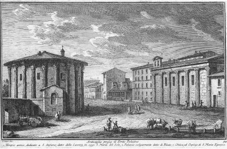 Chiesa di s. Maria EgiziacaPer la rozza struttura, che si vede nel di fuori di questo antico edifizio, si crede essere un tempio de' primi tempi di Roma dedicato alla Misericordia, invece del famoso Asilo, o come altri vogliono, alla fortuna virile, di cui si legge, che bruciando con tutto quello, che vi era dentro, solamente la statua di legno indorata postavi da Servio Tullio fu trovata illesa. L'anno 872. nel Pontificato di Giovanni VIII. fu dedicato alla ss. Vergine, e poi nel 1560. venendo a Roma Sapher Abagaro Ambasciatore del Re di Armenia in tempo di Pio IV. li fu data una chiesa per la sua nazione: ma essendo poi distrutta per dare luogo al nuovo Ghetto degli Ebrei, s. Pio V. li concedè questa, e però vi fu eretto l'ospizio per li pellegrini di quella nazione, e nella chiesa vi fu formato il modello del s. Sepolcro del nostro Salvatore Gesù Cristo. A destra si vede ilPalazzo di PilatoMolto rozza, e curiosa è la struttura di quella poca fabbrica, che dal volgo viene chiamata palazzo di Pilato, dicendo aver quivi abitato quell'ingiusto Presidente, quando fu chiamato a Roma da Claudio Imperatore, per aver condannato a morte Gesù Cristo; ma perchè non vi è alcun documento d'un tal fatto, resterà nella sua incertezza. |