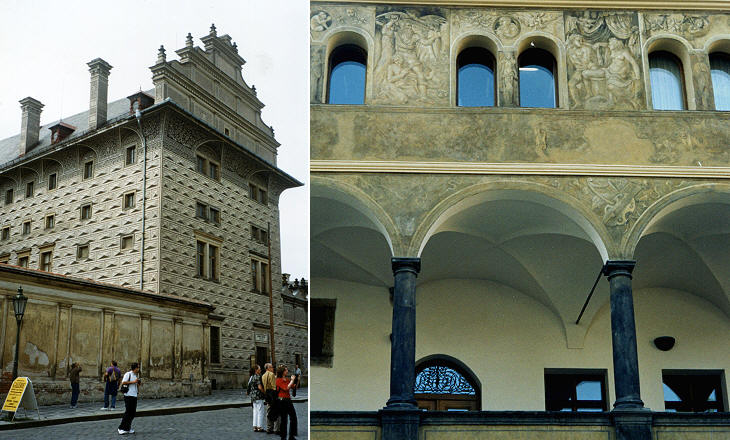 The view over Hradcany shows Schwarzenbersky Palac built in 1563 by Agostino Galli, who lacking the proper stones painted them in order to obtain the bugnato effect of many Florentine palaces and to a lesser extent of some Roman ones, e.g. Palazzo Santacroce. The influence of Italian Renaissance is visible in many parts of Prague. The graffito decoration of palaces and other buildings was very popular in Rome (see Palazzo Istoriato and Palazzo Ricci).