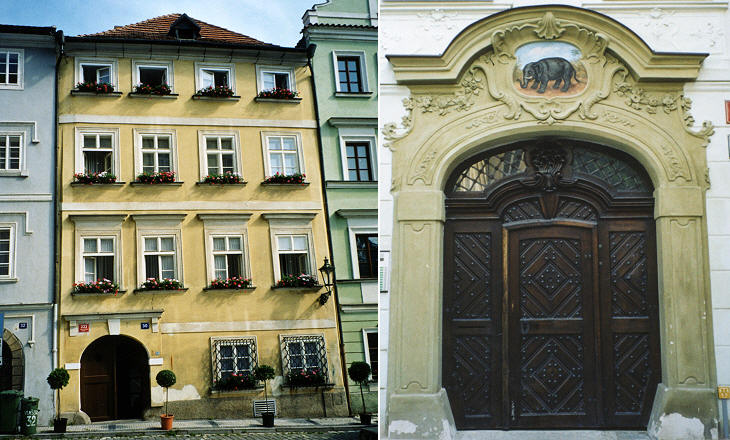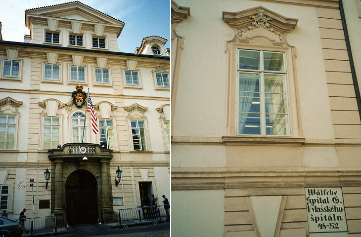 Schonbornsky Palac (XVIIth century) aka Colloredo Palac, today the U.S. Embassy; it has a painted sign to the Italian Hospital of Vlasska in German and Czech