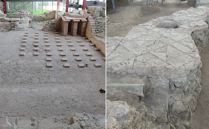 (left) Hypocaust (underfloor heating system) of one of the halls; (right) floor which was decorated with tiles, similar to a floor at Villa dei Volusii near Rome
