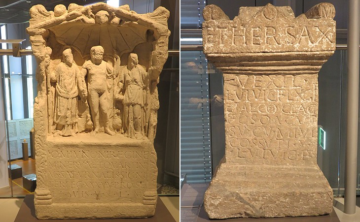 Museum of the Archaeological Park: altars: (left) to Jupiter, Juno and Minerva, a cast from the original in Bonn; (right) to Jupiter and Hercules Saxanus
