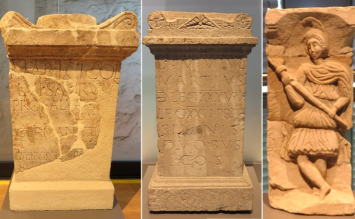 Museum of the Archaeological Park: (left) altar to Mars Cicollus; (centre) altar to Mithra; (right) relief depicting Cautes, a torch-bearer associated with Mithra