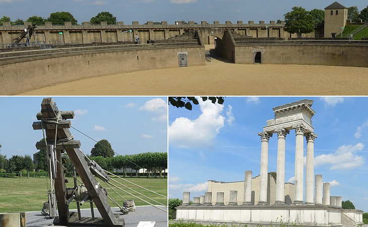 Xanten Archaeological Park: reconstructions of an amphitheatre, of a catapult and of a Roman temple, vaguely resembling Maison Carrée at Nîmes (see other reconstructions in the introductory page)