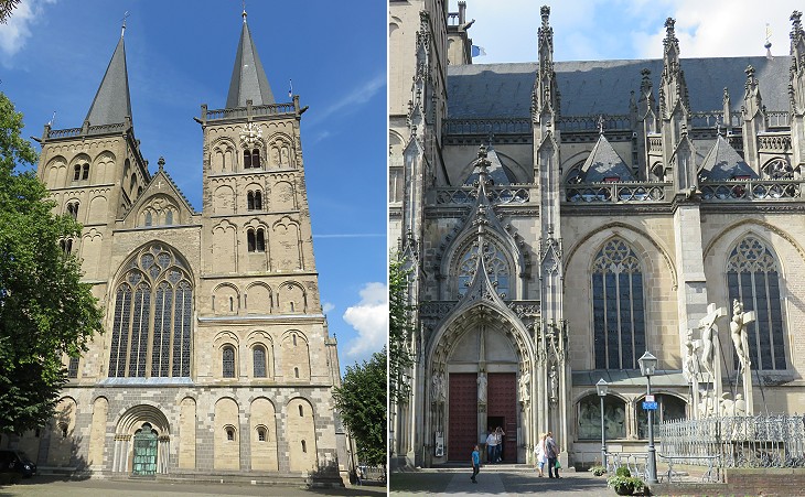 St. Victor's Cathedral: (left) western Romanesque side; (right) Gothic portal