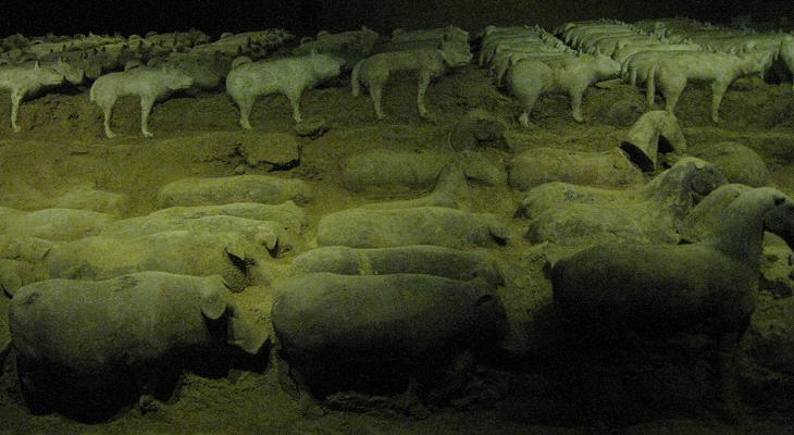 In 1990 during the construction of a road between Xian and its new airport a second terracotta army was found. The burial site has been identified with the tomb of Emperor Jing Di of the Han Dynasty (156 - 141 BC). Whereas Emperor Qin Shi Huang wanted to be followed in the underworld by his army, Jing Di decided to be accompanied by his whole nation. For this reason he ordered that terracotta figurines representing herdsmen and their varied flocks were to be placed next to his tomb in addition to soldiers.