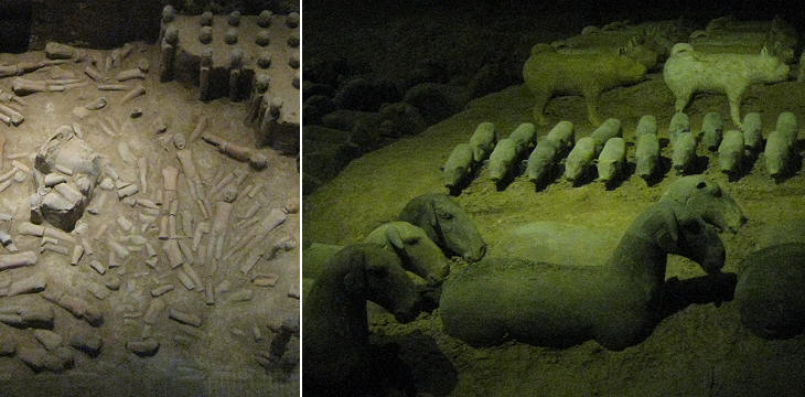 Qin Shi Huang tomb - Pit 1: (left) how the soldiers were found; (right) how they have been arranged