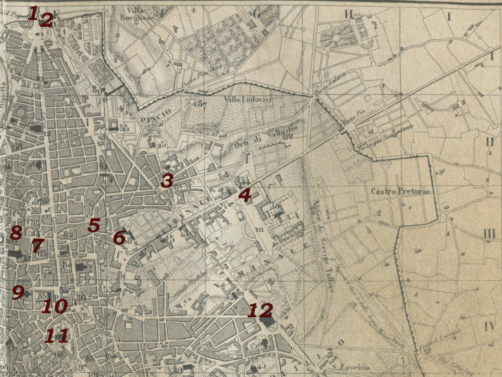The locations are linked to a page where they are shown together with an XVIIIth century etching by Giuseppe Vasi. The links at the names of the popes open in a separate window showing their coat of arms only.