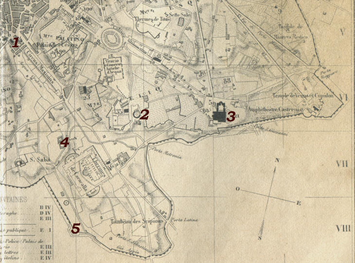 This map of Rome was included in an 1852 French Guide to Rome and it is based on a larger 1841 map by Paul-Marie Letarouilly (*); it shows Rome as it was before the development of railway and the 1870 annexation to the Kingdom of Italy; because it shows Rome in the last years of the Papal government, it is very useful to locate the monuments which house the papal coats of arms listed in the catalogue.